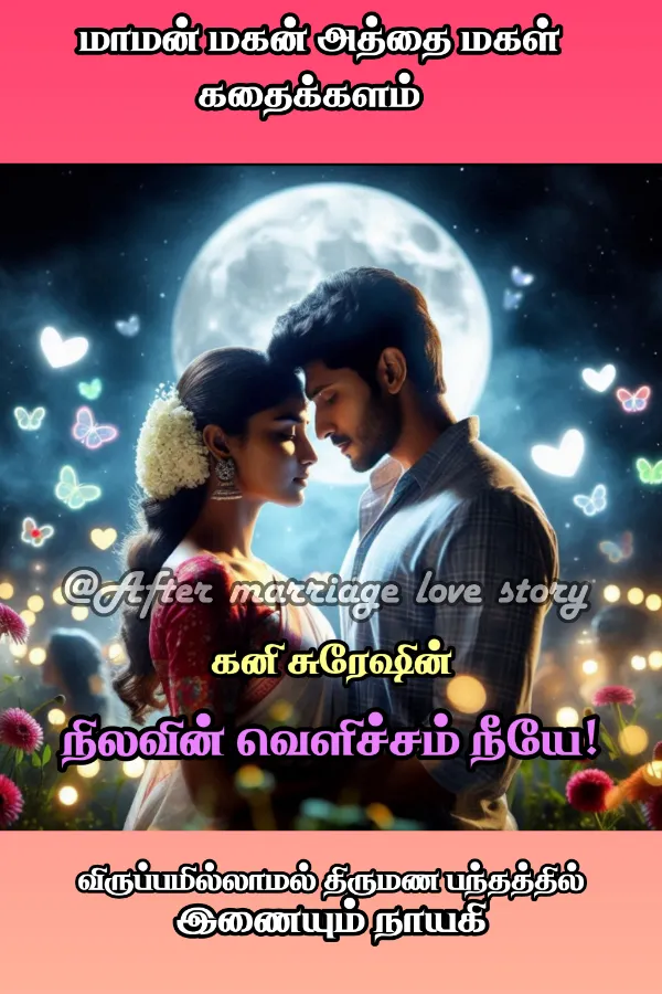 நிலவின் வெளிச்சம் அத்தியாயம் 1 வண்ண வண்ண விளக்குகளால் அலங்கரிக்கப்பட்ட அந்த மண்டபத்தில் நிறைய மக்கள் சூழ்ந்து இருந்தனர். அங்கு ஒரு பெரிய மனிதர் ஒரு பெண்ணிடம் கெஞ்சிக் கொண்டு இருந்தார். இறுதியில் காலில் விழச் சென்றார். பெரியவர் காலில் விழுவது பிடிக்காமல் அப்பெண், “எனக்குத் திருமணம் செய்யச் சம்மதம்” என்று கூறி நகர்ந்து விட்டாள். பின்னர் அந்தப் பெண்ணை பல பெண்கள் அழைத்துக் கொண்டு சென்று அலங்காரங்கள் செய்து மணமேடையில் அமர வைத்தனர். சிறிது நேரத்தில் ‘கெட்டி மேளம் கெட்டி மேளம்’ என்று சத்தத்துடன்...